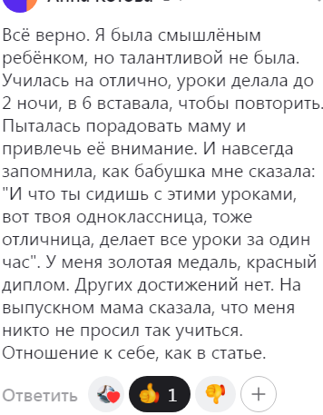 Как мы видели в комментарии, общество может выдать и диплом красный, и медаль. Только дальше психика ребенка обращается к родителю - а это как? Этот диплом ты, родитель, признаешь? Ты мной гордишься? Ты меня хвалишь?