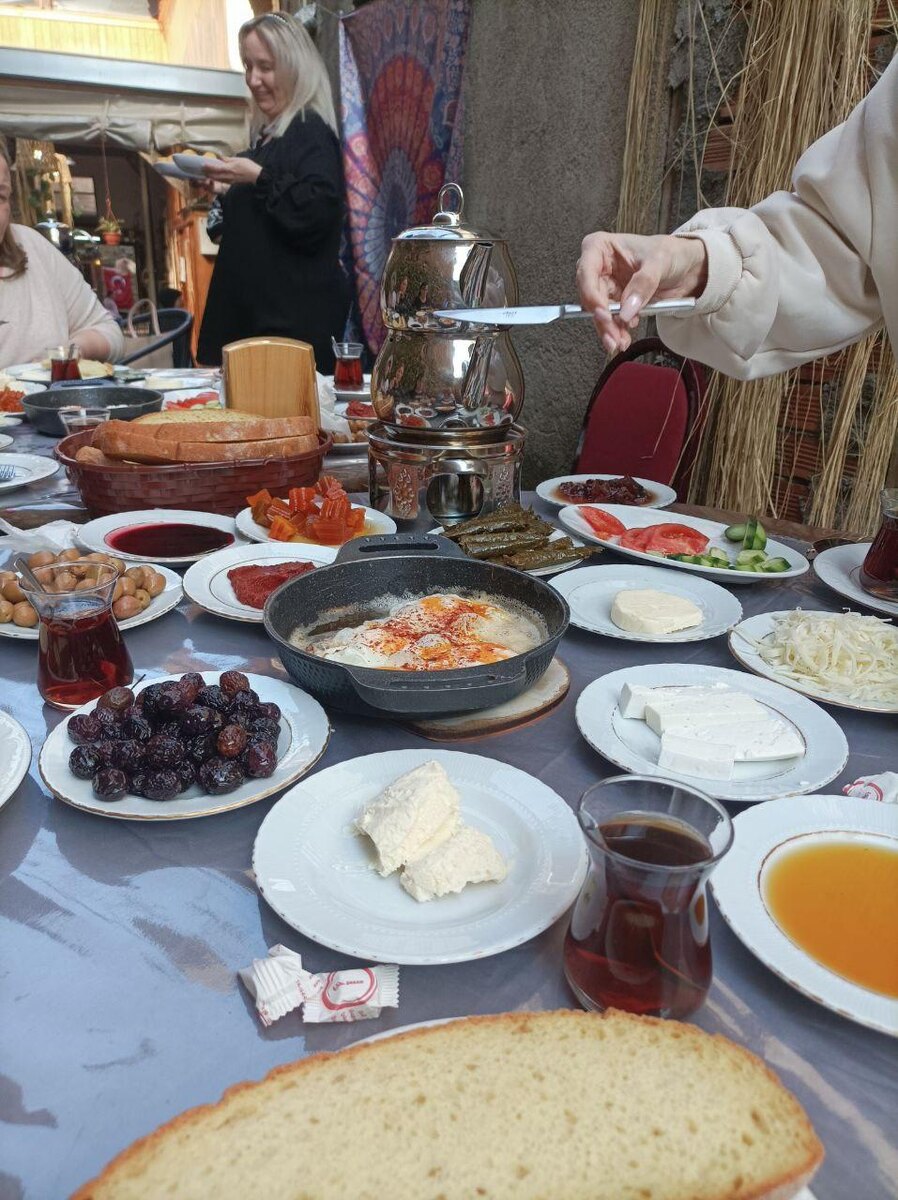 Что еще особенно было приятно, так это то, что никто не заставлял ждать по утрам, все были очень пунктуальны. Видимо, всем не терпелось узнать что мы приготовили на сегодня и прожить еще один прекрасный день. Мы загрузились в машину и направились на завтрак. Да, программу 4 дня мы называем гастродень, так как весь день что-то едим))) Завтрак был организован в деревушке Джумалыкызык, она находится в 15 минутах от дома родителей. Она была основана в 1300-х годах и сейчас входит в мировое наследие ЮНЕСКО. Там снималось множество документальных фильмов и турецких сериалов. А еще очень славится своими деревенскими завтраками. Чем они отличаются от обычных турецких завтраков? Тем что все (или почти все) продукты сделаны или выращены там же. Сыр сделали местные умельцы, варенья закатаны хозяйкой кафе, яйца из курятника соседей.
