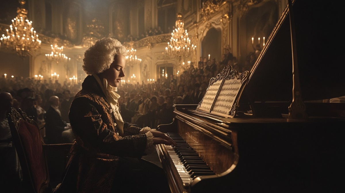 Создано на основе запроса: Child Mozart playing harpsichord on a European stage, elegant audience watching, powdered wig, candlelight