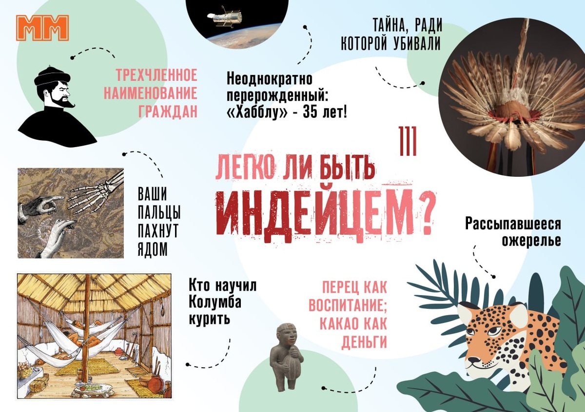 Новый номер «ММ» готов раскрыть все тайные тропы индейцев! На пути вас ждут: история открытия и колонизации Нового Света; грандиозные проекты строительства древних индейских городов; знакомство с Бенито Хуаресом – первым в мире президентом из индейцев и экскурс в самые необычные государственные образования в мире – индейские резервации. А вот легко ли быть индейцем мы узнаем, прожив всего лишь день в племени, научимся языку жестов и узнаем тайну, ради которой убивали. И напоследок расскажем в чем различие дворянских и крестьянских фамилий, как врачи учились мыть руки и конечно же отметим юбилей «народного телескопа» «Хаббла»! Скачивайте номер Мы есть в Википедии Выпуск интерактивный, и мы делаем его для вас. Вы можете оценить нашу работу, перечислив 111 рублей (или больше)