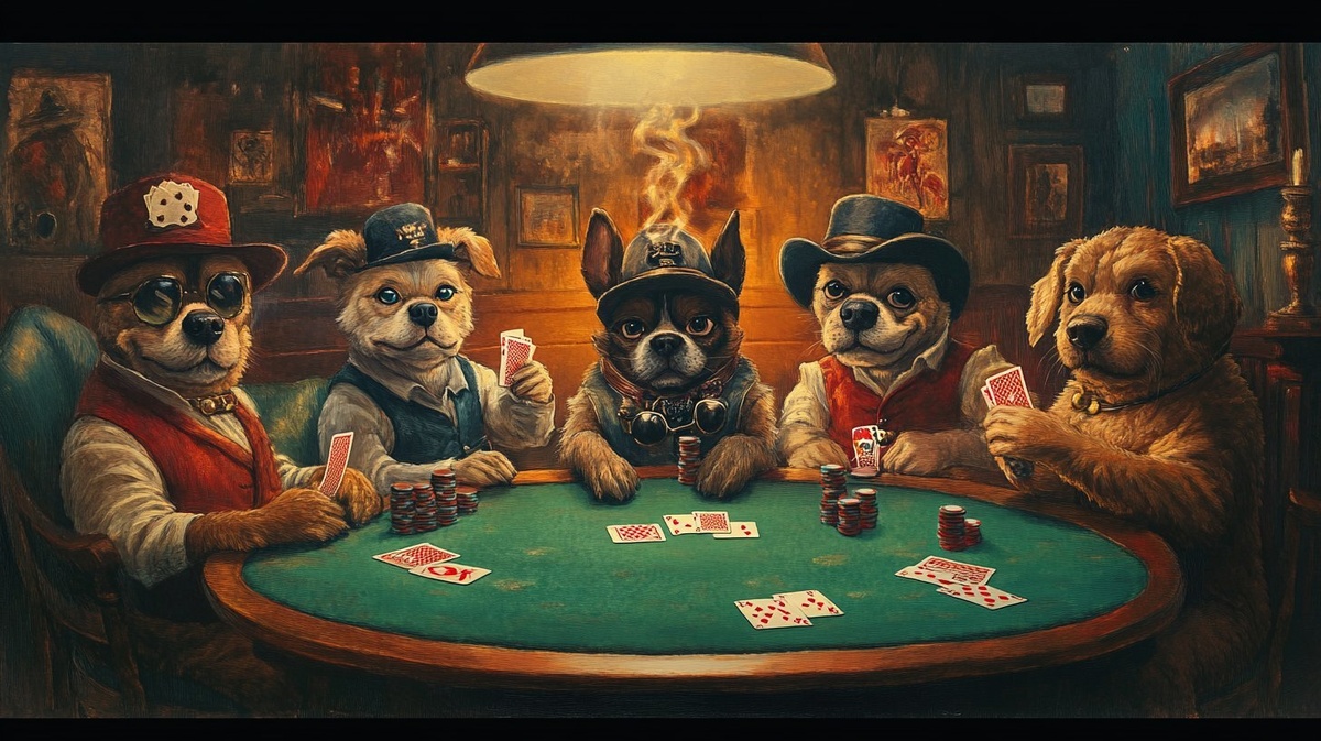 Создано на основе запроса: Five anthropomorphic dogs playing poker around a green table, vintage bar setting, oil painting style, expressive dog faces with hats and vests, detailed background with cigars, chips, and cards, classic warm lighting, humorous and nostalgic vibe --- Автоперевод: Пять антропоморфных собак, играющих в покер вокруг зеленого стола, винтажного бара, стиля картины маслом, выразительные собачьи лица со шляпами и жилетами, подробный фон с сигарами, чипсами и картами, классическое теплое освещение, юмористическое и ностальгическое атмосферу Какое твое мнение? 🤔 https://dzen.ru/id/65c0c65c86e4f837c27b24d7 #ИИ #AI #нейросеть #midjourney #art