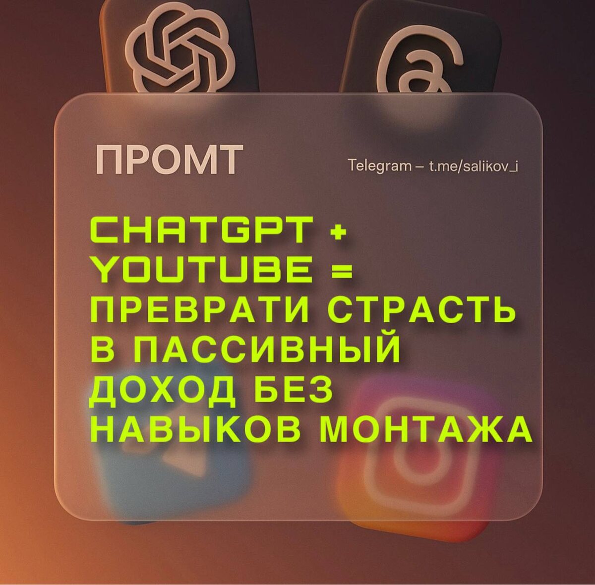 Большинство людей думает, что для YouTube нужны дорогие камеры и крутой монтаж. А умные — автоматизируют весь процесс и всё равно растут. Вот как запустить прибыльный YouTube-канал почти без технических навыков: ⸻ 1 | НАЙДИ СВОЮ ПРИБЫЛЬНУЮ НИШУ Промпт: Дай мне 10 идей для YouTube-ниш, которые требуют минимального монтажа, но при этом имеют высокий спрос и потенциал монетизации. ⸻ 2 | ПИШИ СЦЕНАРИИ БЫСТРЕЕ Промпт: Напиши сценарий для 5-минутного YouTube-видео на тему [твоя ниша/тема] в формате сторителлинга, который зацепит зрителя в первые 30 секунд. ⸻ 3 | АВТОМАТИЗИРУЙ СТРУКТУРУ ВИДЕО Промпт: Создай подробный план видео на тему [тема], чтобы удерживать внимание зрителя от начала до конца, с таймкодами для каждого основного пункта. ⸻ 4 | СОЗДАВАЙ ЗАГОЛОВКИ, ОТ КОТОРЫХ НЕ ОТРЫВАЮТСЯ Промпт: Сгенерируй 10 кликабельных заголовков YouTube-видео для канала в нише [ниша], ориентированного на новичков, которые хотят быстрые результаты. ⸻ 5 | ПИШИ ОПИСАНИЯ, КОТОРЫЕ ЛЮБИТ АЛГОРИТМ П