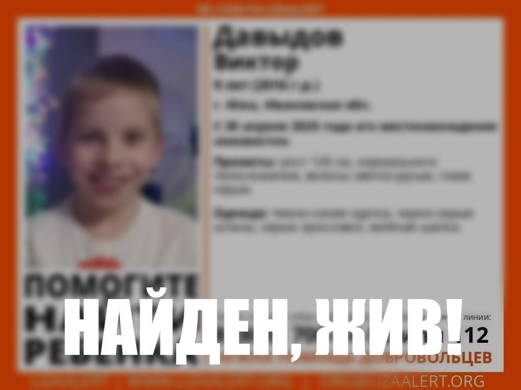 В Ивановской области завершены поиски 9-летнего Виктора Давыдова, пропавшего 30 апреля в Юже. Поисковый отряд «ЛизаАлерт» объявил, что мальчик найден, жив. Подробности не сообщаются.