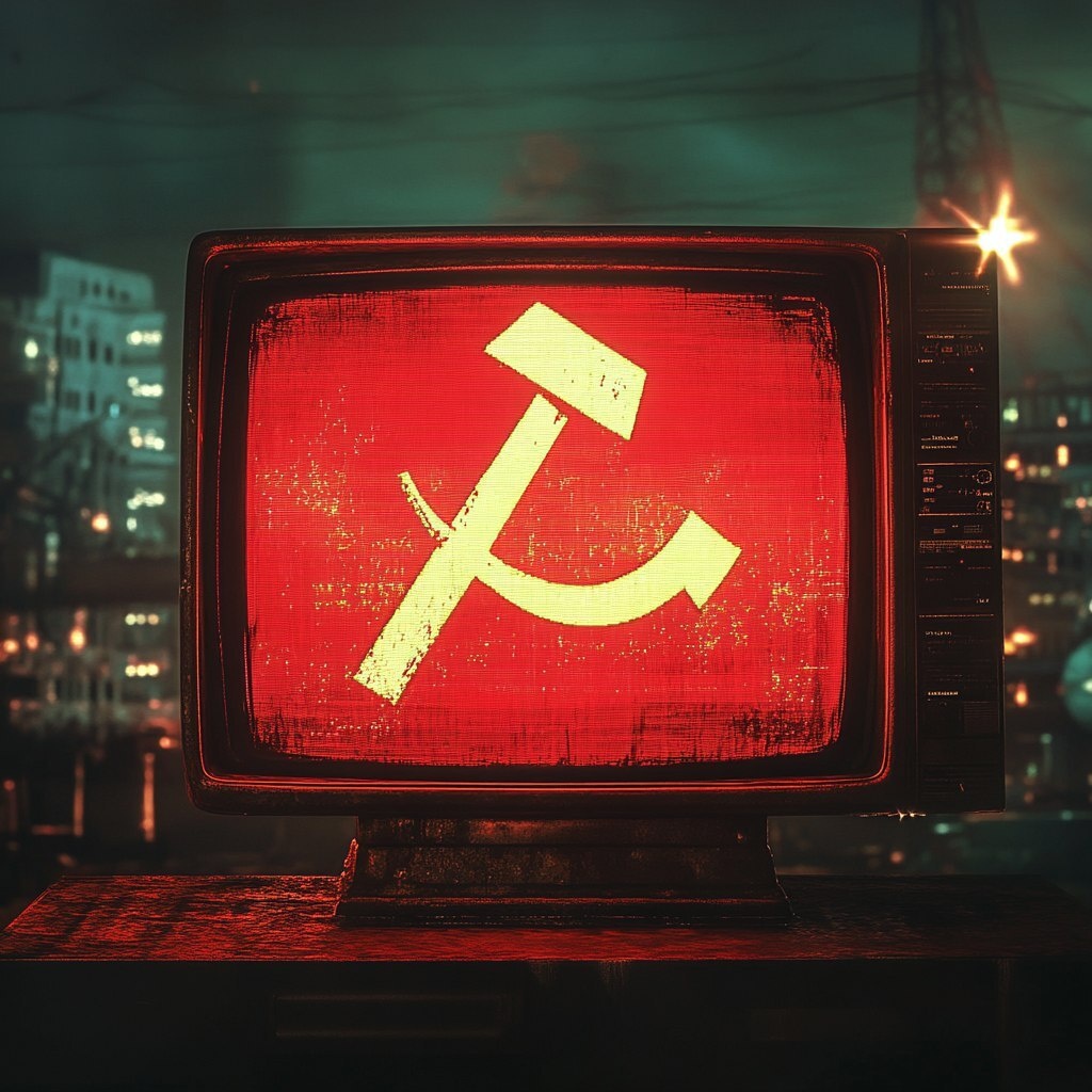 Создано на основе запроса: a retrofuturistic hammer and sickle, on the screen of a retro television