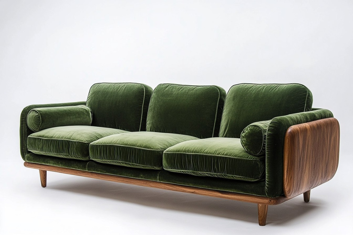Создано на основе запроса: green mink velvet large 3 seater sofa, plush and cozy, luxe style, mid century modern, the armrests have wood