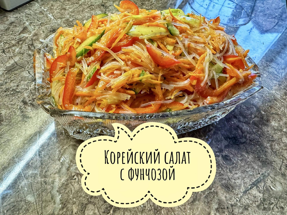 🍜Корейский салат с фунчозой, морковью, сладким перцем и огурцом, сдобренный пряной заправкой. Сочетание вкусов беспроигрышное! 👩🏻🍳Ингредиенты: Фунчоза (стеклянная лапша) Морковь Перец болгарский Огурец Кунжут для посыпки сверху Для заправки: Готовая корейская заправка для фунчозы «Sen Soy” 👩🏻🍳Приготовление: 1. Отвариваем фунчозу по инструкции, залив кипятком на 4 минуты. Откидываем на сито, промываем холодной водой и отставляем в сторону. 2. Очищенный от семян перец и огурец нарезаем тонкой соломкой одинакового размера. 3. Морковь трем на терке для корейской моркови. 4. Соединяем в посуде лапшу с подготовленными овощами, перемешиваем. 5. Заправляем салат специальной заправкой. Перемешиваем снова. 6. И даем настояться около 30-50 мин. при комнатной температуре, чтобы лапша впитала в себя все вкусы. Приятного всем!!