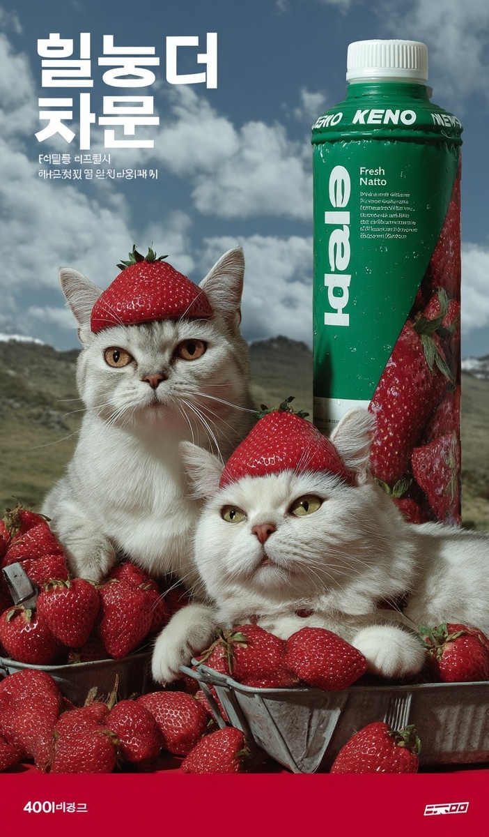Создано на основе запроса: An illustration of two cute cats riding on red strawberries in a green field, with a blue sky and white clouds above them. The title is "Fresh Fruit Nato" in the style of F Kensai. A large apple juice is written in the top right corner of the design, while the bottom left side has text saying "400ml" in Korean. One cat has a hat shaped like a strawberry on its head, while the other has its ears wrapped around its neck to form that shape. They sit near each other in small wheelbarrows filled with strawberries. --- Автоперевод: Иллюстрация двух милых кошек, едущих на красной клубнике в зеленом поле, с голубым небом и белыми облаками над ними. Хорошо получилось? 🤔 https://dzen.ru/id/65c0c65c86e4f837c27b24d7 #ИИ #AI #нейросеть #midjourney #art