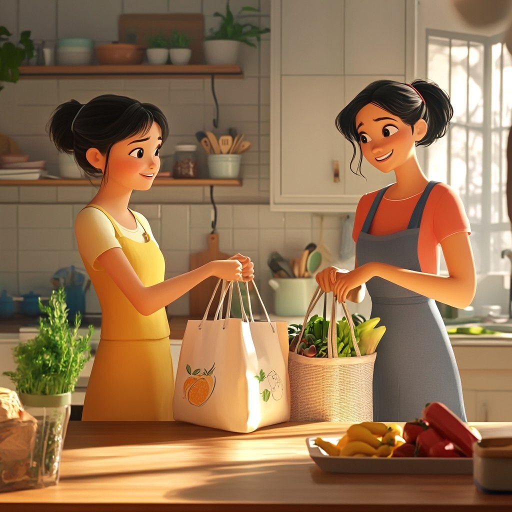 Создано на основе запроса: two women putting bags of groceries on the kitchen counter pixar style