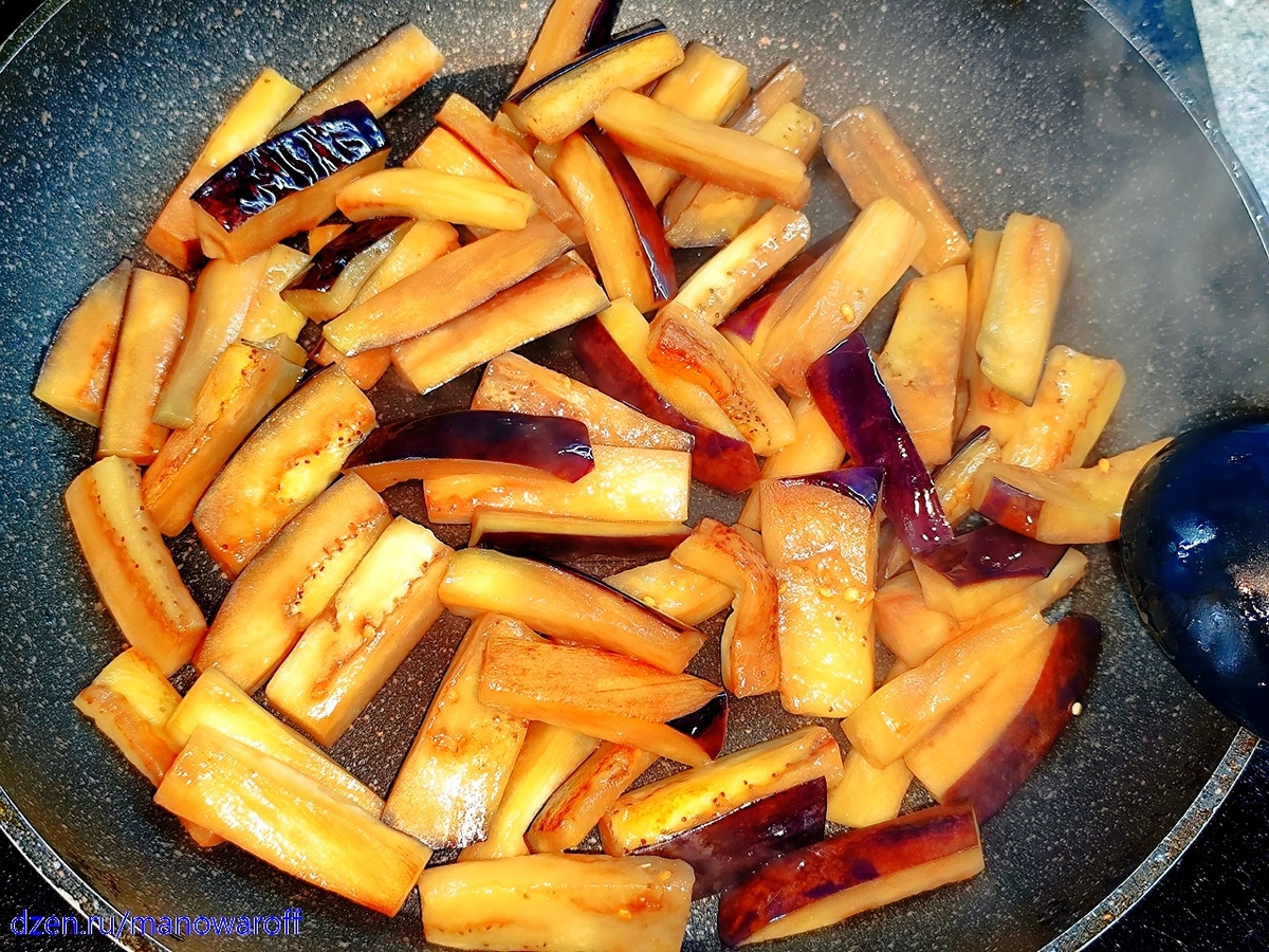 Продолжаем утилизировать соус из черных бобов. И сегодня будем готовить вегетарианское блюдо, для меня являющееся гарниром к мясу. Готовится оно быстро. Из экзотических ингредиентов там только упомянутый соус. Да и то, он уже не является экзотикой. Для приготовления нам понадобится: Баклажан нарезаем брусочками и кладем в кастрюлю с холодной подсоленной водой минут на 20. Затем воду сливаем, а баклажаны слегка обсушиваем бумажными полотенцами. У фасоли срезаем кончики и нарезаем на отрезки длиной 3-4 см. В сковороде на большом огне разогреваем масло и обжариваем баклажаны, пока они не станут мягкими и слегка не подрумянятся. Перекладываем их на тарелку. В сковороду добавляем еще немного масла и обжариваем фасоль, пока она не начнет покрываться корочкой. Перекладываем ее к баклажанам. В сковороду снова добавляем чуток масла, убавляем огонь до среднего, кладем соус из черных бобов и гранулированный чеснок. Обжариваем, постоянно помешивая, в течение минуты. Добавляем баклажаны с фасолью и