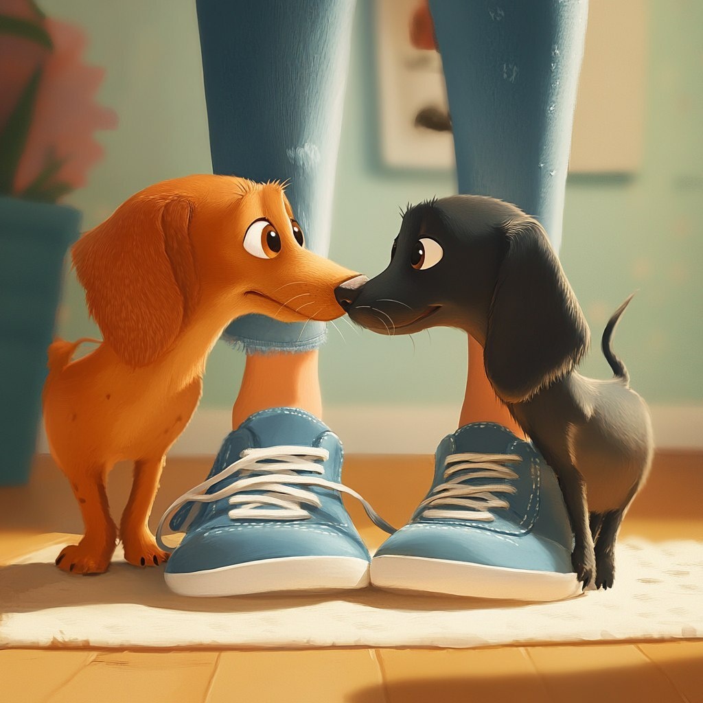 Создано на основе запроса: two dachshunds sniffing a woman's tennis shoes, pixar style