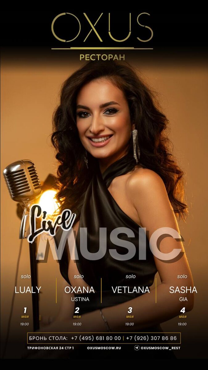 МИР! ТРУД! МАЙ! МУЗЫКА! С Первомаем! С праздником Весны и Труда! 🌸 Досуг на первомайские праздники в OXUS: 1.05 | четверг | 19:00 | LUALY | solo 2.05 | пятница | 19:00 | OXANA USTINA | solo 3.05 | суббота | 19:00 | VETLANA | solo 4.05 | воскресенье | 19:00 | SASHA GIA | solo Ресторан OXUS +7(495) 681 80 00 +7(926) 307 86 86 (WA/TG) Сайт, telegram