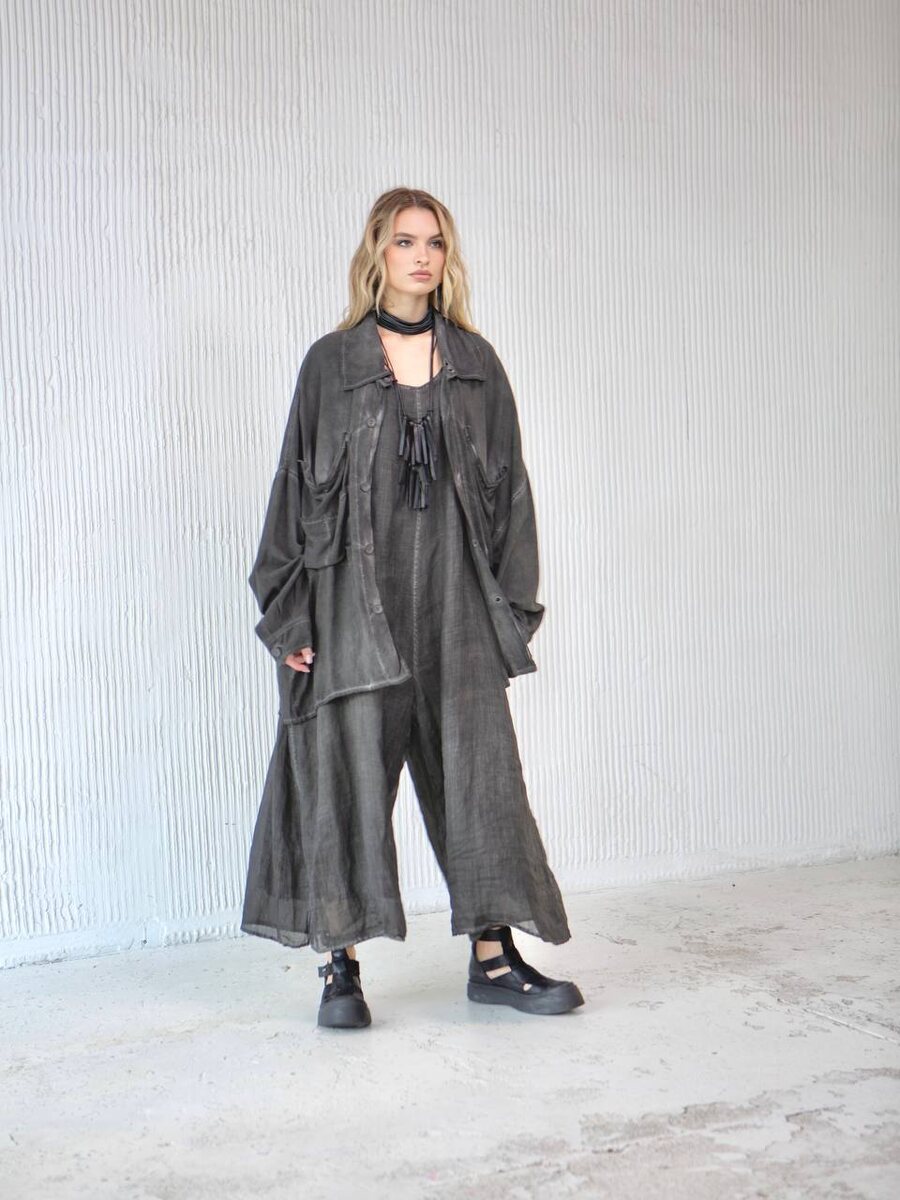 Сложный и эффектный аутфит от бренда LA VACA LOCA — выбор для ценителей интеллектуальной моды. ⠀ В основе комплекта — премиальный хлопок в глубоком оттенке графит. Свободная оверсайз-рубашка с акцентом на асимметричные крупные карманы на груди — арт-объект в гардеробе. ⠀ В паре с ней — авангардный комбинезон из хлопкового батиста с выразительными двойными широкими штанинами, создающими эффект многослойности и движения. Для оптового сотрудничества пишите нам: 📲-в директ 📲-по номеру 8 800 511 51 95 📲- +7 495 146-92-72 📲Наш сайт — https://sollery.pro ✉️-на почту info@sollery.fashion