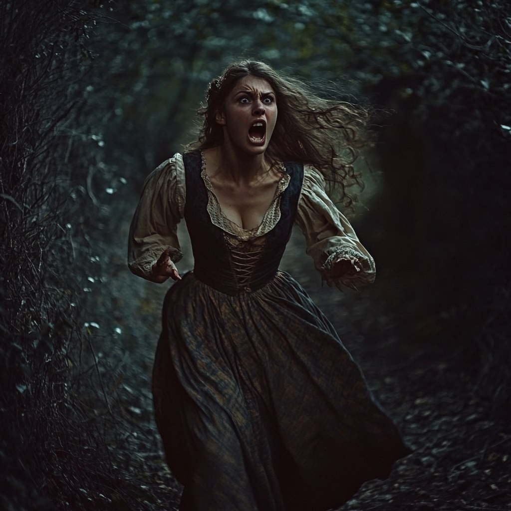 Создано на основе запроса: a beautiful woman in a medieval dress, at night, running terrified through a dark overgrown forest