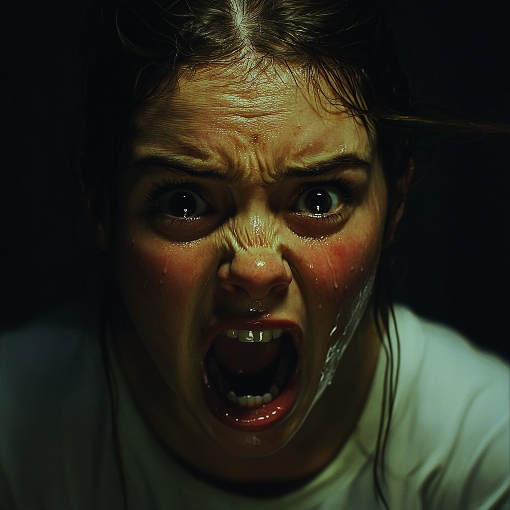 Создано на основе запроса: a straight on front view of a beatiful woman's face with hair tied back, mouth wide screaning in terror and