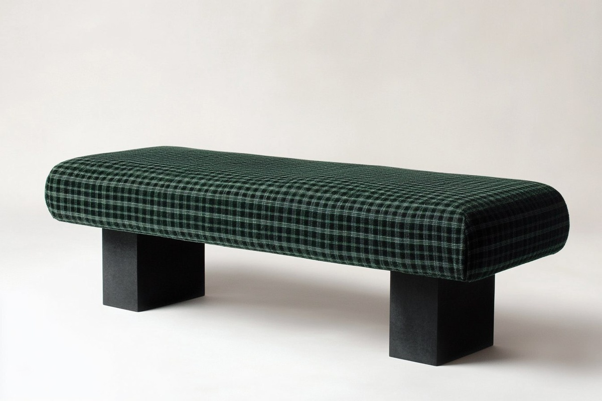 Создано на основе запроса: black and dark green check embossed fabric upholstered thick backless beam bench with dark block base, white