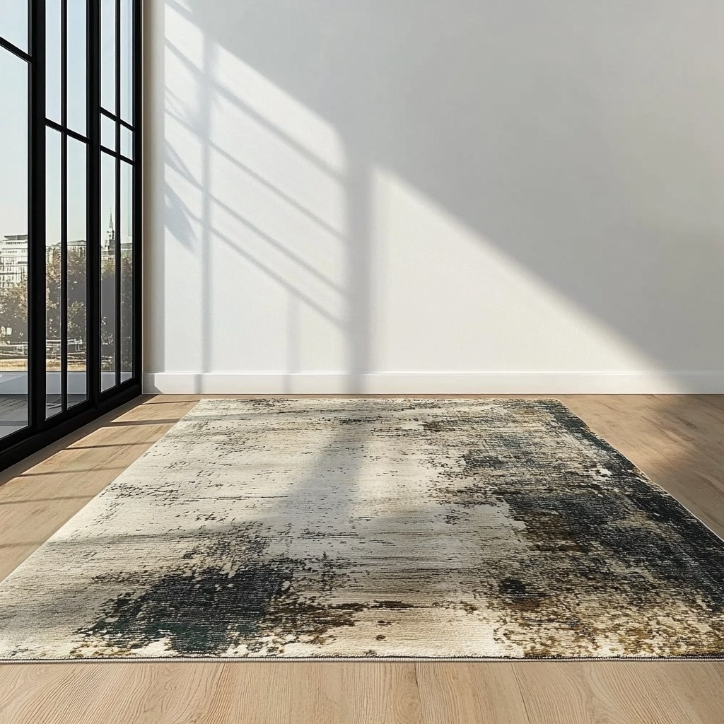 Создано на основе запроса: off white wall, empty room, oak wood flooring, plush cream brown and dark green abstract area rug, sunshine shadows, black framed windows