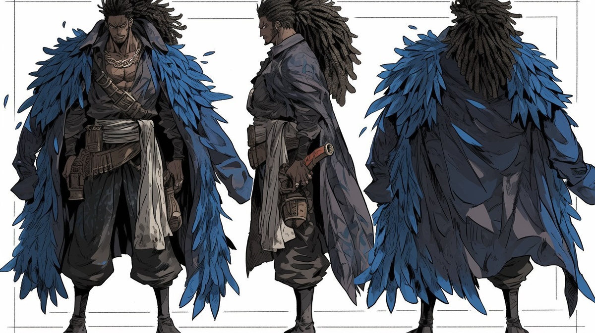 Создано на основе запроса: A detailed manga illustration of a tall black pirate captain, dreadlocks flowing, shown in a full body stance with calm expression. Feathered coat drawn with textured tones, accessories include a large mythical Zoan Devil Fruit pendant, and dual holsters. Posed in front of a blank reference grid for character sheet accuracy. Created Using: manga storyboard format, One Piece black-and-white line art, pen stroke emphasis, toned shading layers, dynamic stance detailing, anime-style character markup