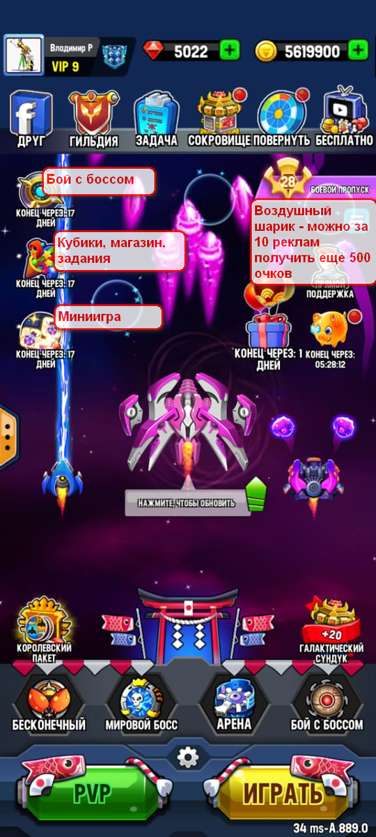 ! Совет. Если в экипировке персонажа есть золотой пистолет, который дает 5К и более урона - он здесь будет очень эффективен против самого босса. Два корабля можно взорвать врезавшись в босса. Дополнительно, если есть, поставь два синих чипа и после врезания в босса у тебя еще будет 10 сек. чтобы наносить повреждение защитой корабля.