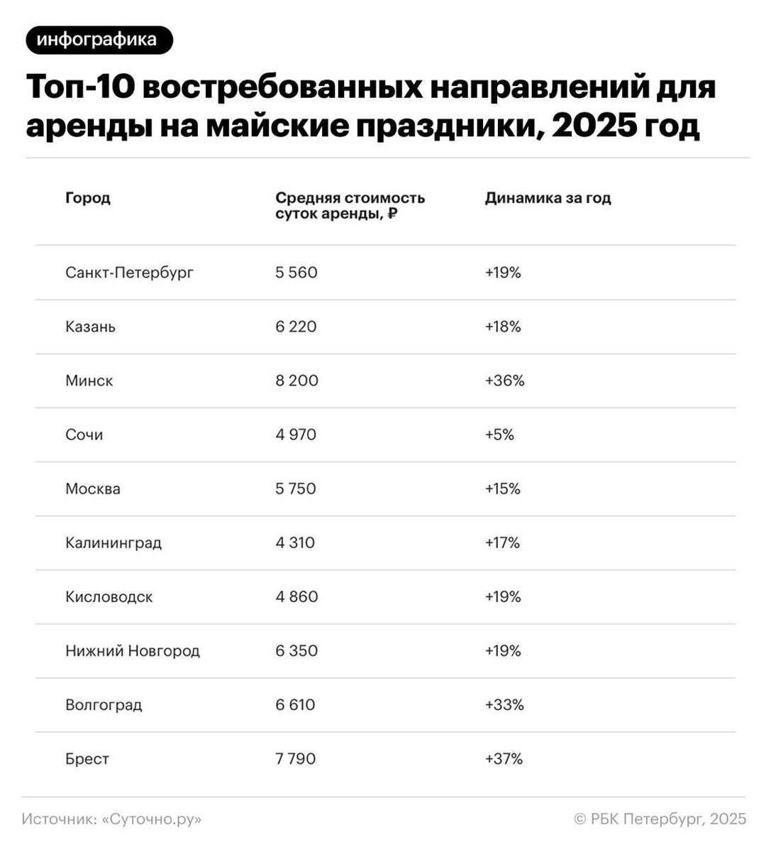 Петербург снова в топе — и это отличный сигнал для инвесторов! Аналитики «Суточно.ру» и «Островка» зафиксировали: спрос на посуточную аренду в майские праздники вырос на 30% по сравнению с прошлым годом. Топ-5 самых бронируемых направлений: Санкт-Петербург, Казань, Минск, Сочи и Москва. Именно в этих городах посуточная аренда приносит максимальную загрузку. Что это значит для собственников? — Уже в апреле было забронировано до 70% всех объектов. — Средняя стоимость ночи — 5 450₽, рост на +19% за год. — В Москве и Петербурге аренда приносит до 22 000₽ за 4 дня отдыха. На фоне высокого спроса цены на аренду растут, загрузка объектов стабильно высокая, а конкуренция среди отелей и гостиниц пока не вытесняет частный сектор — наоборот, спрос на квартиры и апартаменты сохраняется на первом месте. Если у вас есть квартира в одном из туристических городов — или вы только планируете инвестицию, — напишите @JEIN_Gai4ka Помогу рассчитать доходность и подобрать недвижимость под посуточную аре
