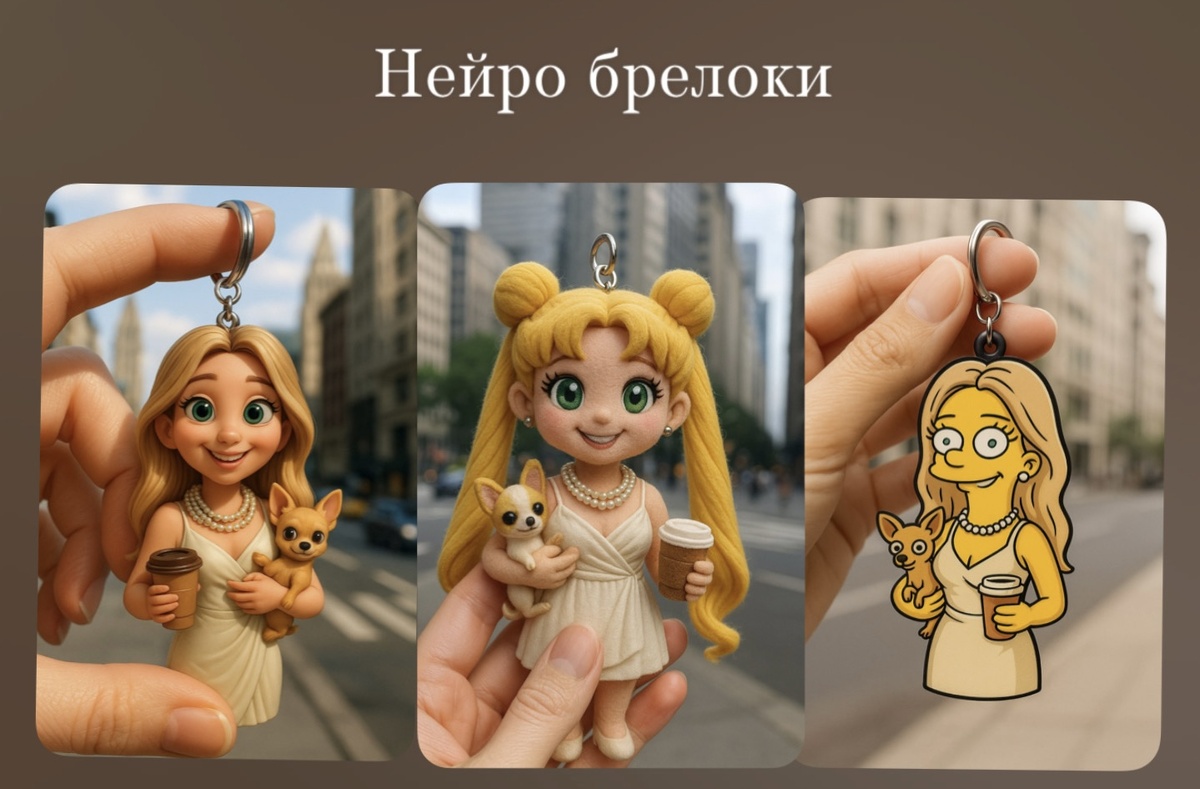Делаем брелки в стиле Disney, Sailor Moon и Simpson Syntx – Menu – Дизайн с ИИ – Sora Images отправляем свое фото и промт : «Создай брелок в реалистичном стиле Disney по этому фото. Глаза у куклы – зеленые. Маленькая кукла держит под подмышкой маленькую собачку породы чихау-хуа, в другой стакан кофе. Выражение лица счастливое и милое. Брелок с куколкой держит реалистичная рука женщины. Фон изображения – улица большого города. Фокус изображения на кукле, показывая богатство деталей в одежде, волосах и аксессуарах» Я генерирую при помощи Syntx. Ссылка на бота - тут (больше промтов ТГ канале t.me/iiphoto_annasem)
