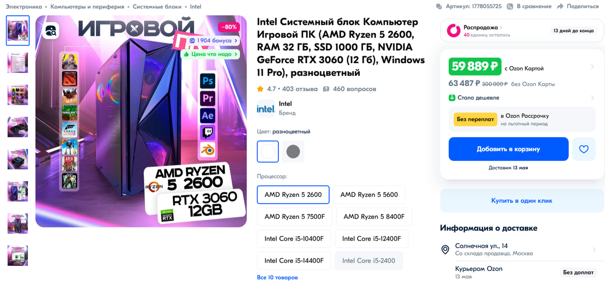 Мне стало интересно, что сейчас покупает народ, и в первых строчках я нашёл игровой компьютер с рейтингом магазина (не товара) - 4.7 за 59900 рублей. Заранее скажу, что это не реклама. Просто разберём такой вариант, стоит ли оно того, а также посмотрим, сколько можно сэкономить, если собирать такой компьютер самому.