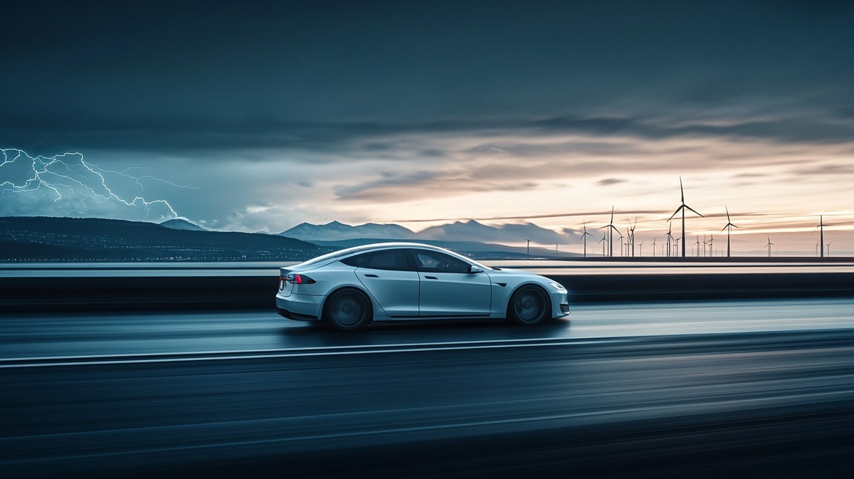 Создано на основе запроса: White Tesla Model S in motion on a highway with the ocean in the background and wind turbines off in the