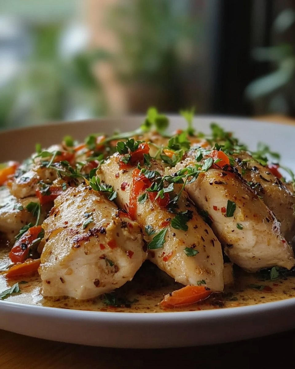Создано на основе запроса: | Title: Creamy Garlic Chicken | Close-up Shot right view, taken by a photographer with a high quality camera
