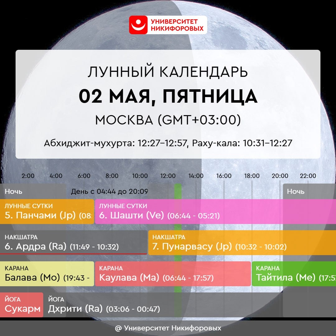 2 МАЯ, ПЯТНИЦА Резкие и неблагоприятные энергии дня присутствуют до половины первого дня. Это время для разрушения ненужного, для отпускания старого. После время становится более благоприятным и спокойным. Не стоит сегодня что-то пробовать сделать второй раз, если не получилось ранее. Если к вам придут подобные предложения, например, начать все сначала в отношениях или снова работать в определенной сфере или на определенного человека – возьмите время на раздумье до субботы-воскресенья. Хороший день для романтики и свиданий, особенно его вторая часть. Также это подходящее время, чтобы обновить гардероб, косметику. Но есть риски сильно потратиться – держите четкую сумму в голове, сколько будет разумно вложить в эти покупки.