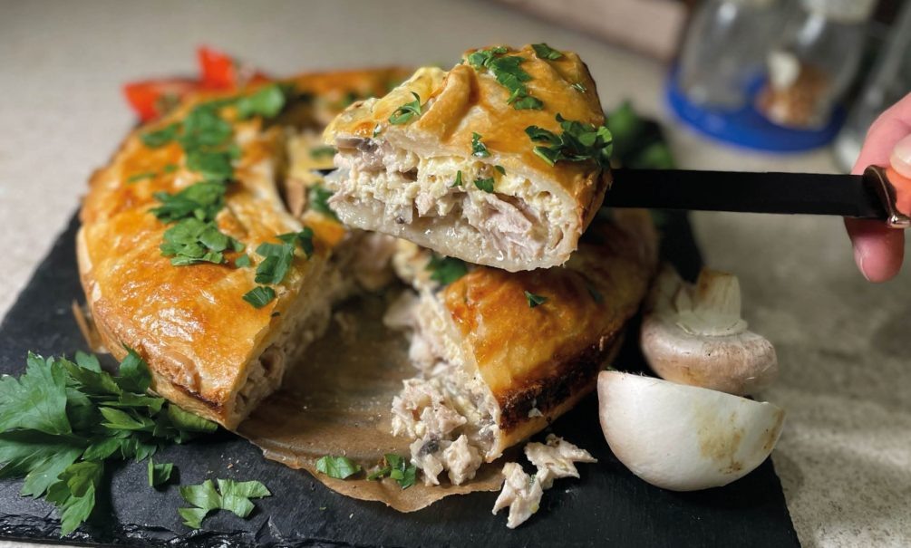 Шеф-повар дает рецепт пирога, который приготовит даже брутал Нежданные гости – тот еще квест для хозяйки или хозяина. Но если в морозилке завалялись пачка слоеного теста и мясной фарш, то можно приготовить мясной пирог на скорую руку. Его приготовление по силам даже тем, у кого руки «из тазобедренных суставов» растут. Для быстрого пирога понадобятся -слоеное бездрожжевое тесто – одна пачка (400 г); -фарш свино-говяжий – 400 г; -помидорки черри – 150 г; -репчатый лук– 1 шт.; -чеснок – 3-4 зубчика; -сыр моцарелла – 150 г; -сыр твердый – 100 г; -яйца куриные – 2 шт.; -сливки 10 % – 200 мл; -соль, перец, мускатный орех – по вкусу. СОВЕТ. Для приготовления «быстрого» пирога лучше взять разъемную либо стеклянную форму. ШАГ 1. Стол необходимо присыпать мукой и выложить на него лист размороженного слоеного бездрожжевого теста. Тесто надо раскатать так, чтобы оно подошло точно по размеру формы. ШАГ 2. Смажьте растительным маслом форму для выпечки, и уложите внутрь тесто, заворачивая его на неб
