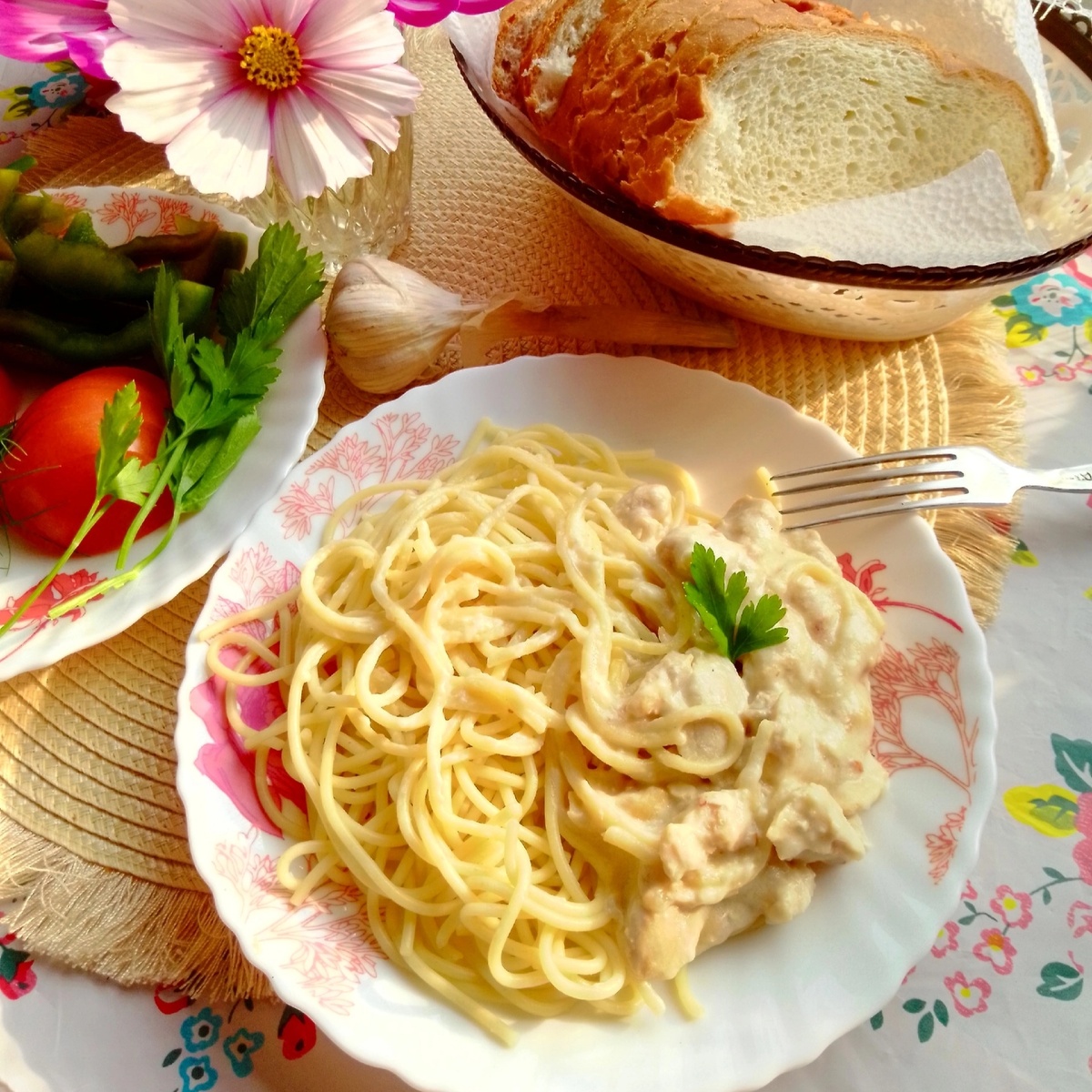 Поздравляю всех с Днем весны и труда🌱🏠🌞 Уже открыли дачный сезон? Мы еще нет, так как на улице пока холодно) Надеюсь в ближайшие дни потеплеет, и сьездим, наконец, на дачу, а то уже соскучились☺ И конечно же буду делиться нашими дачными новостями и рецептами😍 А пока что поделюсь одним из наших любимых дачных блюд: Паста с курицей под соусом Бешамель🍝 Ингредиенты: Спагетти 200 грамм Филе 1 куриной грудки Репчатый лук 0,5 -1 шт Соль, черный молотый перец по вкусу Для соуса Бешамель: 25 грамм сливочного масла 250-350 мл молока (в зависимости от того, какой густоты соус хотите) 1-1,5 столовые ложки муки Спагетти отварить до готовности. Куриное филе нарезать на небольшие кусочки и обжарить с репчатым луком до готовности. Сделать соус Бешамель: в кастрюльку выложить сливочное масло, поставить на огонь и подождать, пока масло растопится. Затем добавить муку, перемешать и проварить пару минут на медленном огне, следить, чтобы не пригорело. Затем постепенно добавлять молоко, хорош