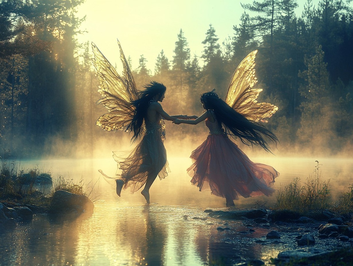 Создано на основе запроса: a male fairie with long black hair and golden transparent wings and a female fairie with long black hair and golden transparent wings, both fairies are dressed in pink clothes and they are dancing on the shore of the misty lake, in the backround there is the lake and a scandinavian ancient spruce and pine forest with trees, rocks, vegetation, early morning time where rays of the sun radiate through the mist, --- Автоперевод: Мужская фери с длинными черными волосами и золотистыми прозрачными крыльями и женской фей с длинными черными волосами и золотыми прозрачными крыльями, обе феи одеты в розовую одежду, и они танцуют на берегу туманного озера, на заднем плане, есть озеро и скандинавское сон. Как тебе иллюстрация? 🤔 https://dzen.ru/id/65c0c65c86e4f837c27b24d7 #ИИ #AI #нейросеть #midjourney #art