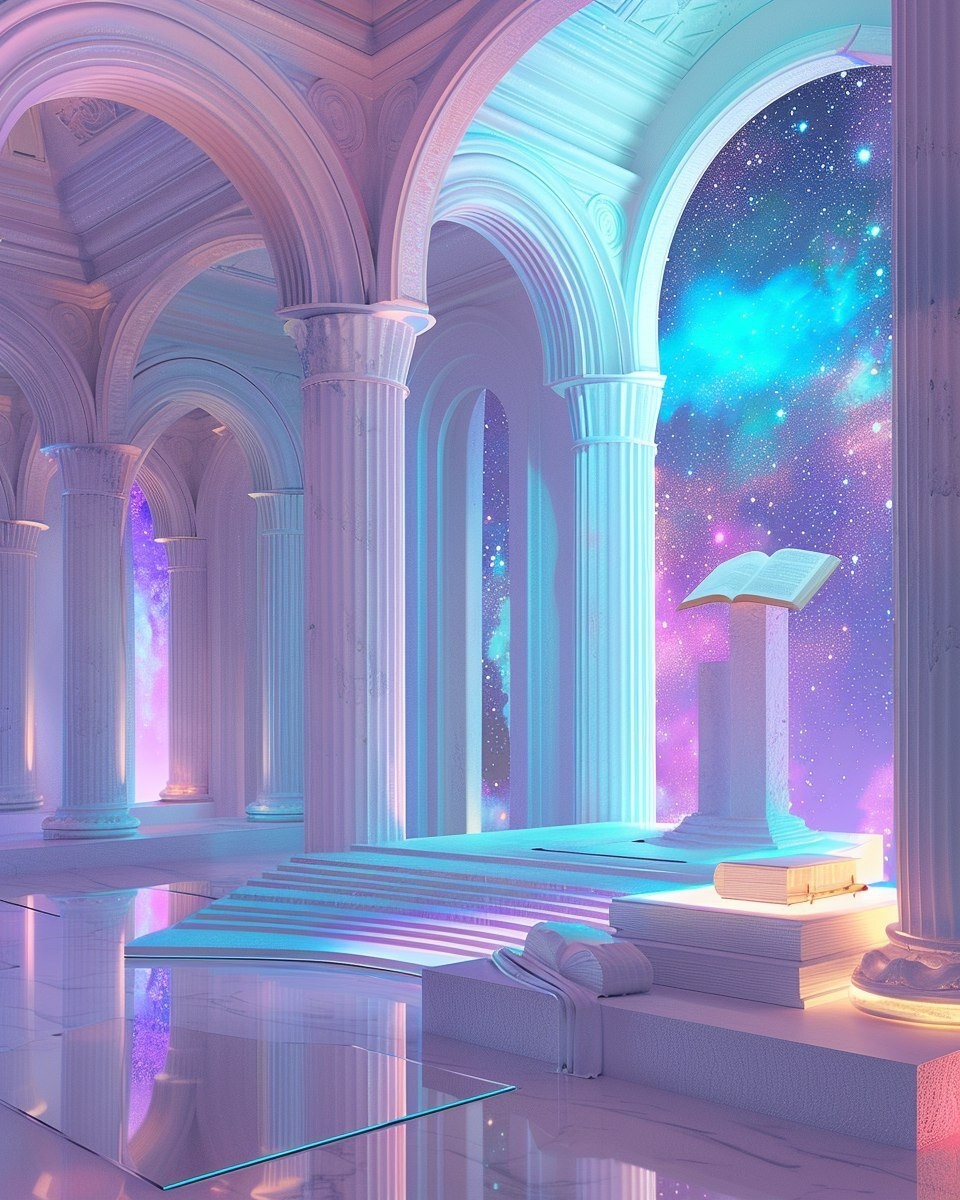 Создано на основе запроса: surreal floating white temple in the cosmos, archways lined with glowing books, giant floating open book on pedestal, galaxy window showing stars, pastel holographic tones, #DEFE08, #FDBBAC --- Автоперевод: Сюрреалистический плавучий белый храм в космосе, арки, выровненные светящимися книгами, гигантская плавающая открытая книга на пьедестале, окно галактики, показывающие звезды, пастельные голографические тона, #defe08, #fdbbac Отлично получилось? 🤔 https://dzen.ru/id/65c0c65c86e4f837c27b24d7 #ИИ #AI #нейросеть #midjourney #art