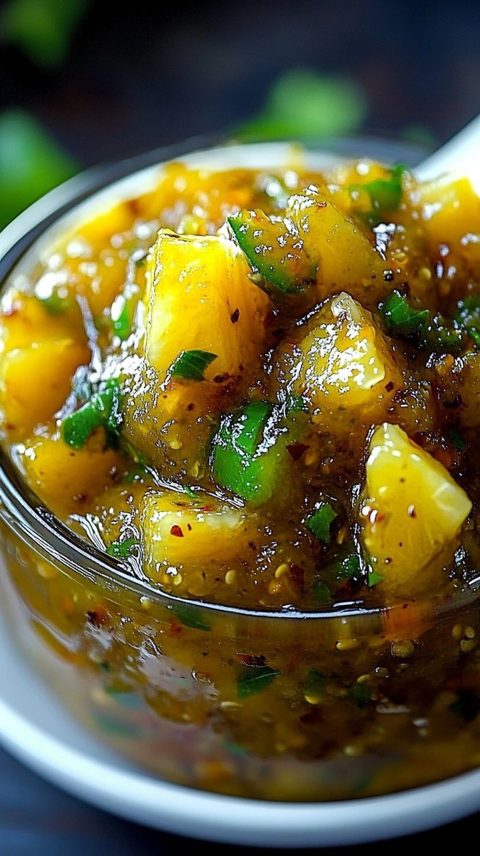Создано на основе запроса: | Title: Spicy Pineapple Jalapeño Chutney | Close-up Shot right view, taken by a photographer with a high quality