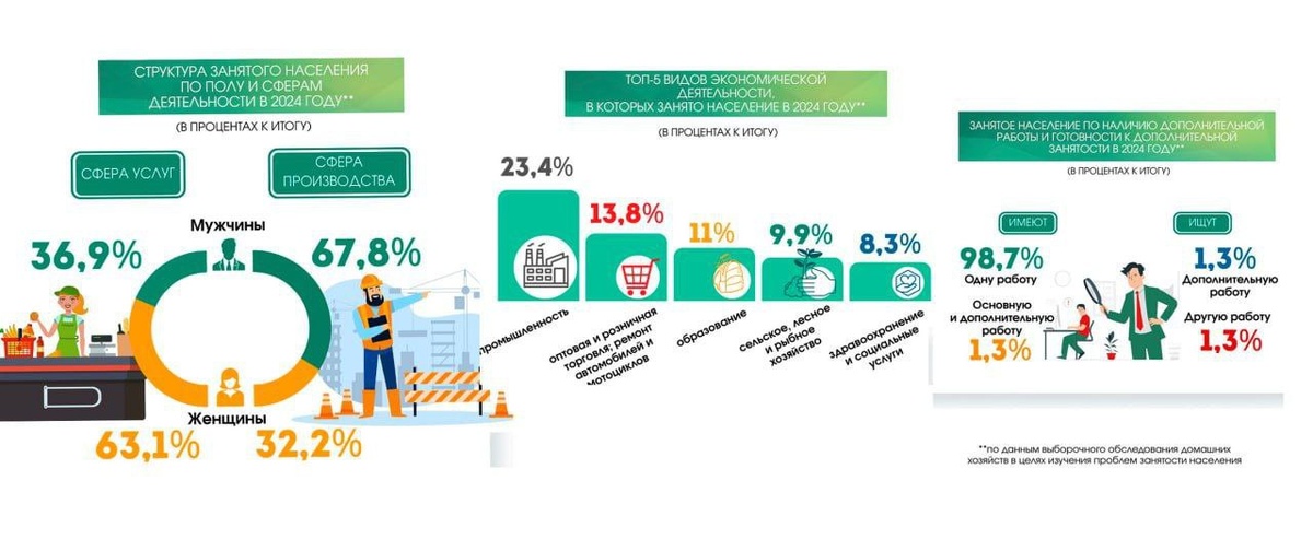 Белстат назвал топ-5 видов деятельности, в которых заняты белорусы: Лидирует промышленность — 23,4%. На второй строке рейтинга — оптовая и розничная торговля, ремонт автомобилей и мотоциклов (13,8%). 11% населения Беларуси работает в сфере образования, 9,9% - в сельском, лесном и рыбном хозяйстве, 8,3% — в здравоохранении и социальных услугах.