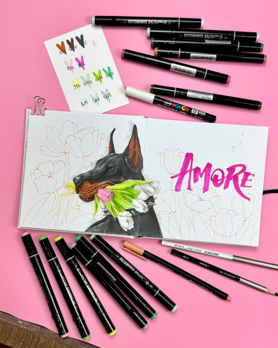 Сегодня приглашаем вас нарисовать маркерами очень эффектный сюжет: - элегантный доберман с букетом тюльпанов - оригинальный фон - стильная надпись Урок уже доступен к просмотру всем участникам клуба! 📌 Если вы еще не с нами, присоединиться можно в любой момент: https://dariart.monecle.com/lg/blog