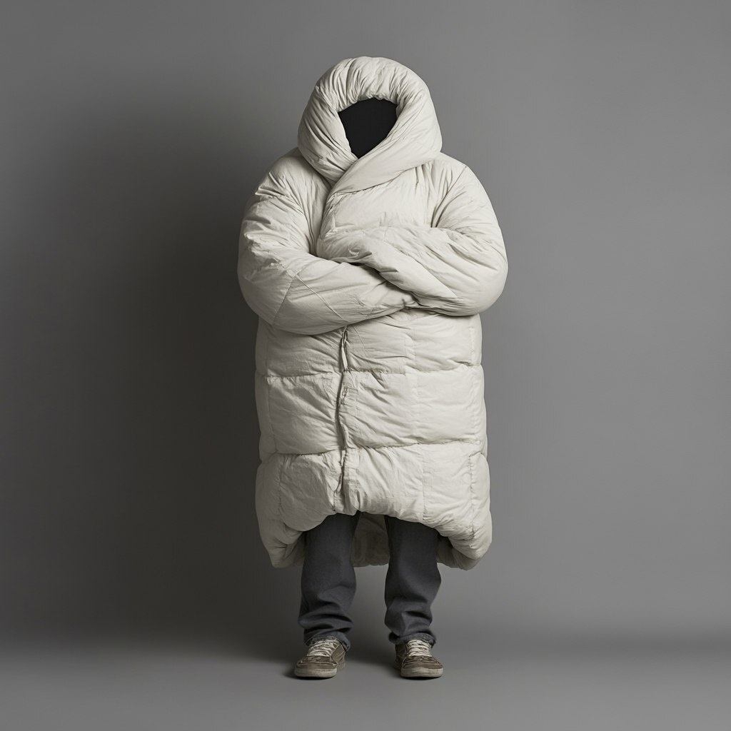 Создано на основе запроса: person covered in a duvet with the shape of a coat. Fitted on the waist line --- Автоперевод: человек, покрытый пуховым одеялом с формой пальто. Как тебе иллюстрация? 🤔 https://dzen.ru/id/65c0c65c86e4f837c27b24d7 #ИИ #AI #нейросеть #midjourney #art