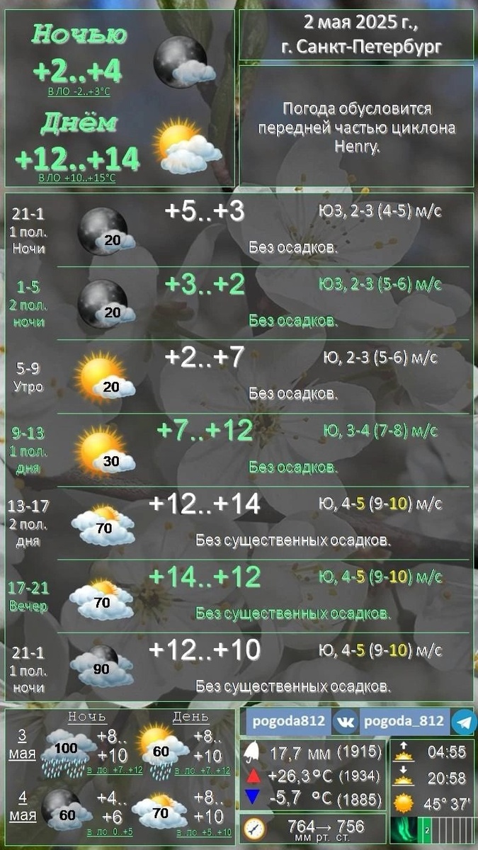 #прогноз@pogoda812 ПРОХЛАДНЫЙ МАЙ Завтра, 2 мая, в Санкт-Петербурге ночью ожидается около +2°С, малооблачно и без осадков. Днём температура достигнет +14..+15°С, но, начиная с утра, облака постепенно начнут затягивать небо. Днём будет еще переменная, а к вечеру значительная облачность. В ночь на субботу, 3 мая, будет пасмурно и пройдут умеренные дожди. Днём также сохранится вероятность кратковременных дождей. Температура в течение суток будет колебаться в районе +7..+11°С. И, наконец, в воскресенье, 4 мая, ожидается +4°С ночью и примерно +10°С днём. Облачность будет переменной, существенных осадков не ожидается. Поздравляю всех с началом мая и желаю всем хороших праздников и настроения!