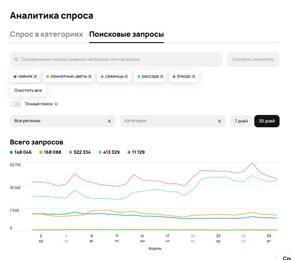 И вот нам еще одна предсказуемая стата весны: синхронные активные запросы о рассаде и саженцах, и их активность нарастает. То ли еще будет в мае. 😎