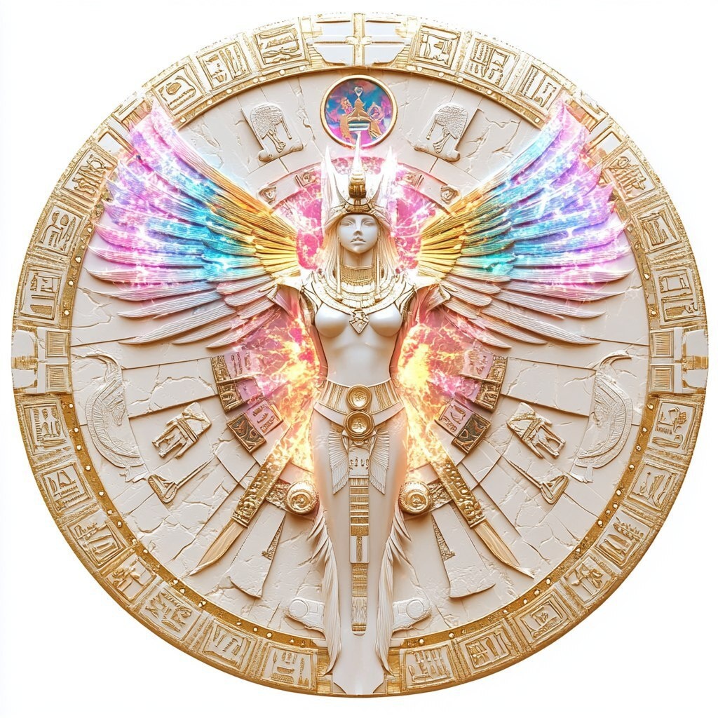 Создано на основе запроса: celestial rainbow goddess shaped sun portal with ancient symbols and light codes overlaying the top of it