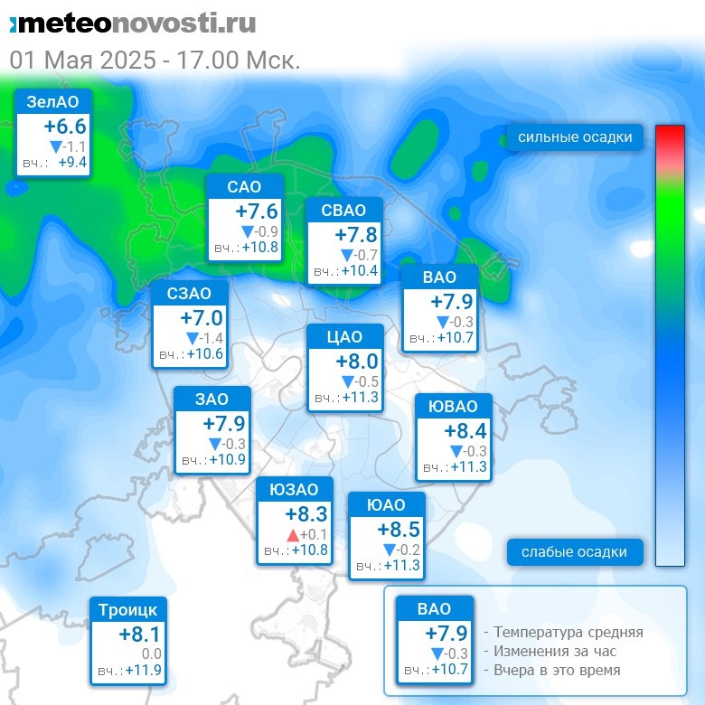 В 17:00 в Москве было от +6.2°C до +8.8°C, средняя температура +7.9°C #погода #Москва #весна #температура #1мая #четверг