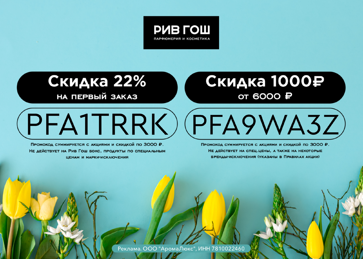 Новинки в РИВ ГОШ и новый промокод! В РИВ ГОШ собрана отличная подборка новинок этой весны по приятным ценам, к примеру: ⭐ Невероятный аромат от Byredo Desert Dawn Eau de Parfum; ⭐ Освежающие румяна в стике от Revolution Makeup Fast Base Blush; ⭐ Очищающий мусс с отличным составом для сияния кожи Caudalie Vinoperfect Brightening Micropeel Foam; ⭐ Классные тревел и солнцезащитные наборы. Эксклюзивные косметические бренды и нишевая парфюмерия в РИВ ГОШ сейчас со скидками до 80%. Забирайте промокоды и отправляйтесь за покупками: PFA8WGOP - скидка 10% на один первый или повторный заказ от 2 000₽ на SPF для лица и тела Скидка по промокоду суммируется со скидками и ЗК. Не действует на РИВ ГОШ бокс, продукты по специальным ценам и марки-исключения. Работает до 30 апреля! PFA1TRRK - скидка 22% на первый заказ Суммируется с акциями и скидкой по ЗК. Не действует на РИВ ГОШ бокс, продукты по специальным ценам и марки-исключения. PFA9WA3Z – скидка 1 000 ₽ на один первый или повторный заказ от 6 00