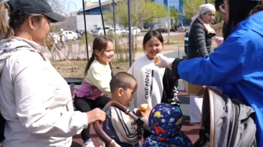 - Мы, волонтёры «Астана жастары». В этот праздничный день наши волонтёры не сидят дома, сложа руки. Они вышли на улицу, чтобы дарить людям радость, а именно в честь Дня единства народа они начали раздавать бауырсаки. Сегодня волонтёров около 15, и они заряжены такой бодростью, праздничным настроением и готовы тем же настроением заряжать наших граждан.