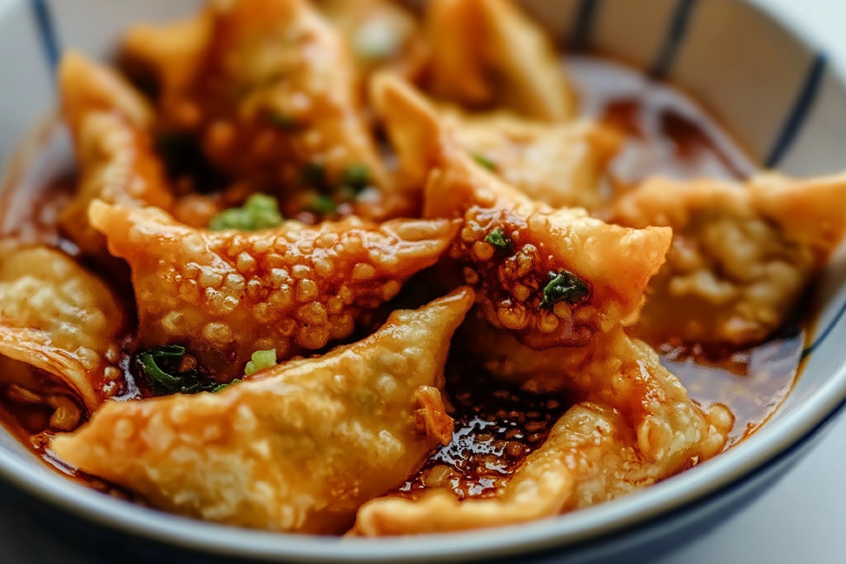 Создано на основе запроса: | Title: Chicken Wontons in Spicy Chili Sauce | STYLE: Close-up Shot right view | EMOTION: realistic as possible