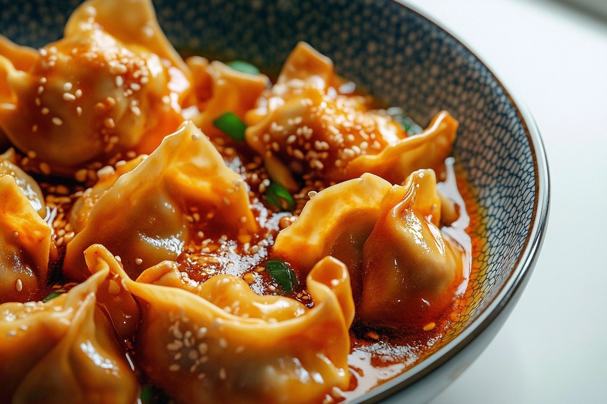 Создано на основе запроса: | Title: Chicken Wontons in Spicy Chili Sauce | STYLE: Close-up Shot right view | EMOTION: realistic as possible