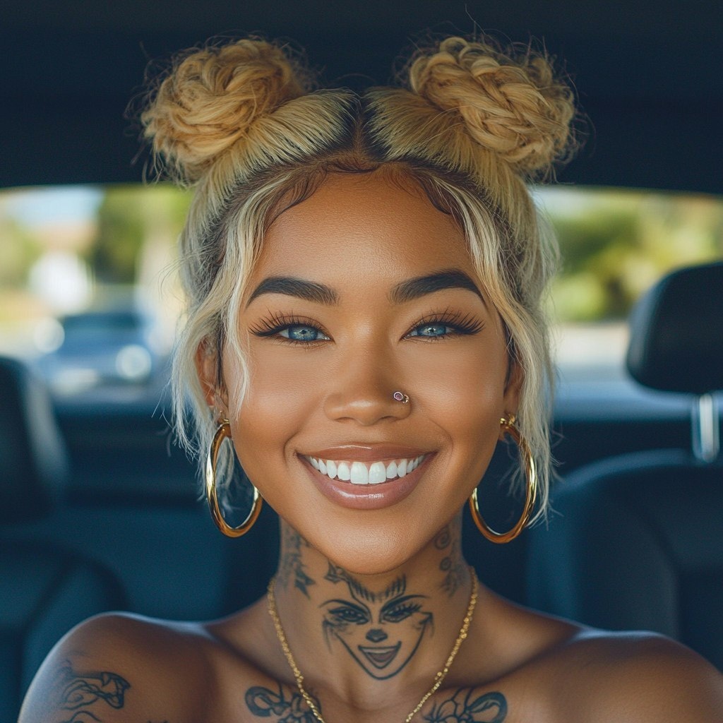 Создано на основе запроса: Jhené Aiko, with blonde hair in space buns and blue eyes, wearing gold hoop earrings, smiling widely while