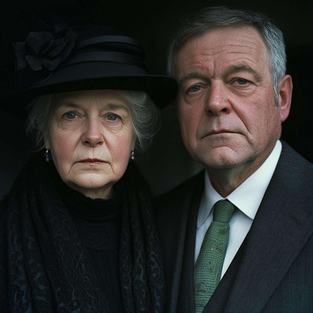 Создано на основе запроса: A 60 year old woman and a 40 year old man are attending a cremation. They are British, white, with interesting features, blue eyes, captivating looks and are looking directly at the camera. She is wearing a black dress, black shawl, and a black hat. He is wearing a dark grey suit and white shirt with a green tie. The image is a close up of their face and upper bodies and they have serious expressions