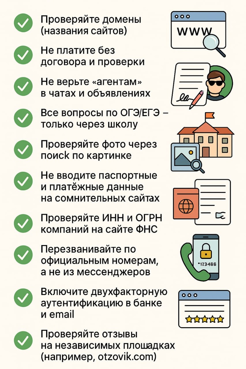 🛡🚩 Что делать, чтобы не попасться на уловки мошенников в рекламе? ✅ Проверяйте домены (названия сайтов) – Перед оплатой или вводом данных — смотрите👀 на адрес сайта (URL). – Часто идет подмена одной буквы (yaandeks.travel вместо yandex.travel). – Используйте whois.domaintools.com или nic.ru/whois/ для проверки возраста домена: мошенники — это недавние регистрации. ✅ Не платите без договора и проверки – Проверяйте ИНН/ОГРН юрлица на сайте egrul.nalog.ru – Уточняйте: есть ли офис, телефон, официальные реквизиты. – Требуйте договор или хотя бы паспорт даже при частных услугах (аренда, праздники). ✅ Не верьте "агентам" в чатах и объявлениях – Telegram, WhatsApp, соцсети, форумы, сайты объявлений — любимые площадки мошенников. – "Горящие" туры и билеты – повод насторожиться. – Никогда не переводите деньги по номеру телефона без проверки. ✅ Все вопросы по ОГЭ/ЕГЭ — только через школу – Школы не рассылают SMS и не принимают оплаты через переводы. – Любая "экстренная пересдача" по ссылк