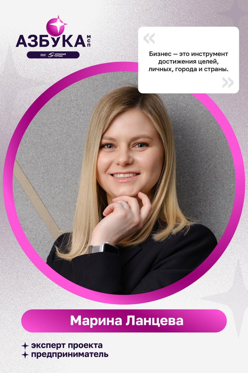 Кто стоит за методологией проекта «Азбука МСП»? Встречайте — Марина Ланцева — эксперт по развитию людей, предпринимательского мышления и создатель образовательных трансформаций. 💖13 лет в обучении и развитии; 💖Сооснователь компании Learning Space — 400 000+ обученных; 💖 Автор 170+ программ, методолог, ментор и трекер предпринимателей, запускающих реальные проекты. «Бизнес — это инструмент достижения целей (личных, города, страны)», — считает Марина. Она не просто обучает — эксперт создаёт смыслы, стратегии, системы, которые работают в жизни и бизнесе. В проекте «Азбука МСП» именно она будет помогать участникам пройти путь от идеи до устойчивого проекта с ценностью для людей и города. Если вы чувствуете, что в вас есть энергия, идеи, стремление — этот человек поможет превратить это в работающий, полезный и нужный бизнес. #Азбука_МСП #полезное от экспертов Союза «Атомные города»