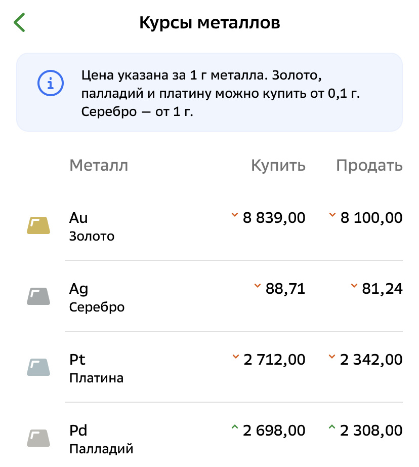 Помните, как я собирала виртуальный портфель на миллион рублей? Поделила на 4 равные части, одну вложила в акции, другую - на вклад, третью - в золото, а четвертую... Эх, жаль я те статьи удалила, память-то подводит. ))) В общем, у меня очередной виртуальный эксперимент. Реальных денег для вложений в металлы у меня нет, а проверить, что было бы (и будет у тех, у кого деньги есть) с такими вложениями в течение года, очень интересно. Свой эксперимент я начинаю 1 мая, а итоги подведем 1 мая следующего года. Ну и 1-го числа каждого месяца буду подводить промежуточные итоги. Вложиться в золото и другие металлы я решила через ОМС (обезличенный металлосчет) в приложении банка. На сегодня, 1 мая, вот такие цены на покупку и продажу: Да уж, выглядит довольно пессимистично, если вдруг деньги понадобятся. ) Но это я со своей колокольни нищеброда, откладывая хоть что и хоть куда, сразу представляю, как мне эти деньги позарез нужны и как я буду их со счета изымать. ) На самом деле инвестиции