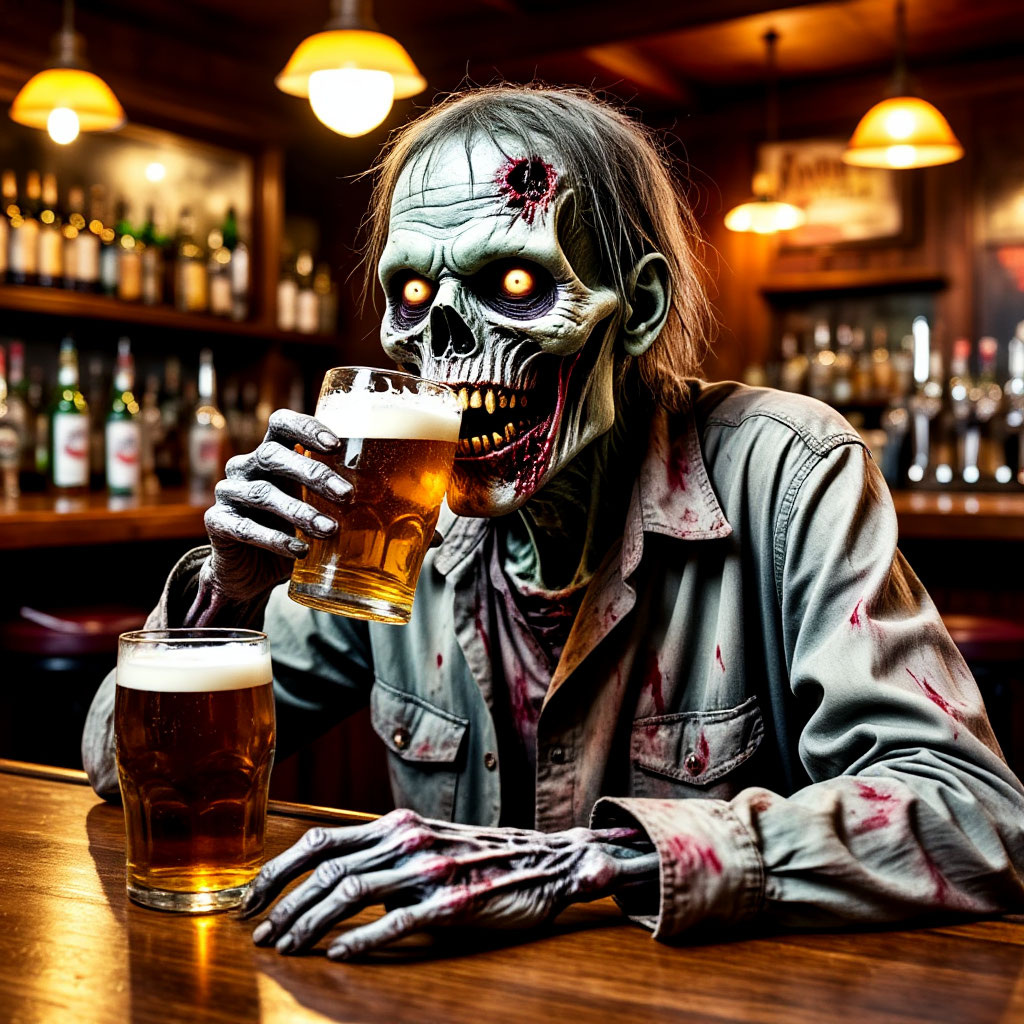 В баре пахло как всегда: пивом, немытыми полами и несбывшимися надеждами. Я сидел у стойки, вертя в руке стакан дешёвого пойла. За окном выли сирены, но бармен с лицом бывшего боксера, делал вид, что это так и должно быть. — Эй, парень, — хрипло бросил он, вытирая бокал грязной тряпкой. — Слышал, город кишит зомби? — Зомби? — я хмыкнул. — Похоже, они наконец-то нашли работу для всех этих дармоедов из муниципалитета. Дверь со скрипом распахнулась. Вошёл парень в рваной рубашке, с лицом цвета подпорченного хлеба. Одна рука болталась, словно по ней проехал грузовик. — Чёрт! — вскрикнул бармен, — опять... Зомбак подошёл к стойке, уставившись на бутылки неживыми глазами. Из горла вырвался стон, похожий на скрип несмазанной двери. — Эй, приятель, — я повернулся к нему, — тебе тоже налить? Он замычал – мозгиии… — Мозги? Ты ошибся дверью — я усмехнулся. — Здесь только пиво и ностальгия. А у меня... — я стукнул пальцем по лбу, — тут давно пусто. Зомбак наклонил голову, пытаясь разобрать, что я